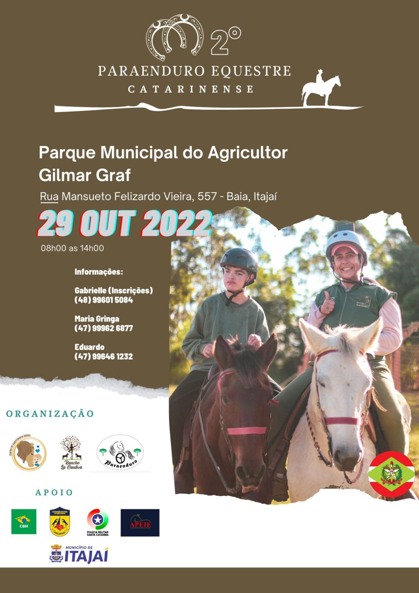 Segundo a Sra. Claudiane no próximo dia 29/10/22, acontece em Itajaí/SC, o 2o Paraenduro Equestre Catarinense; evento organizado pelo Centro de Equoterapia Rafael, Rancho La Cautiva e Paraenduro.