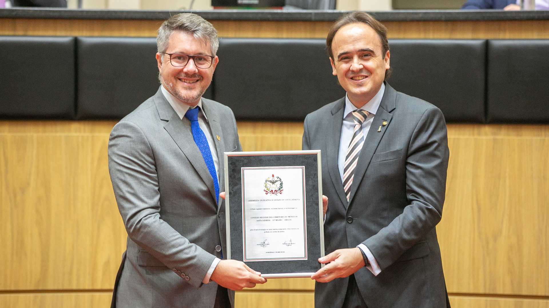 O presidente do Creci, Fernando Willrich, recebe homenagem do deputado Carlos Humberto, durante a sessão desta segunda (17) (Fotos: Agência AL)