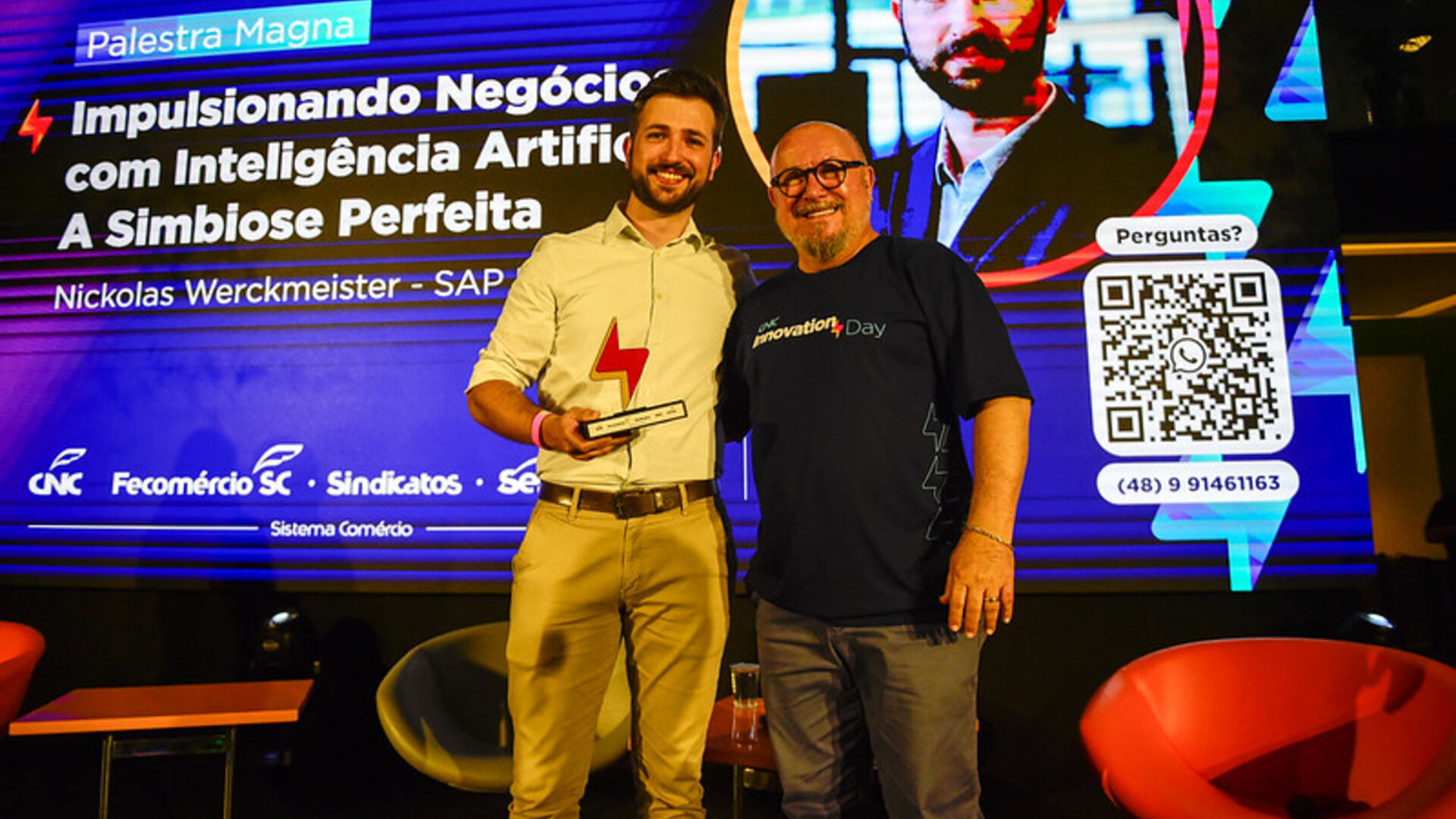 A programação encerrou com palestra Magna “Impulsionando Negócios com Inteligência Artificial: A Simbiose Perfeita” encerrou a programação do CNC Innovation Day em Florianópolis com fala do Head de Tecnologia e Transformação da SAP Labs Latin América, Nickolas Werckmeister.
