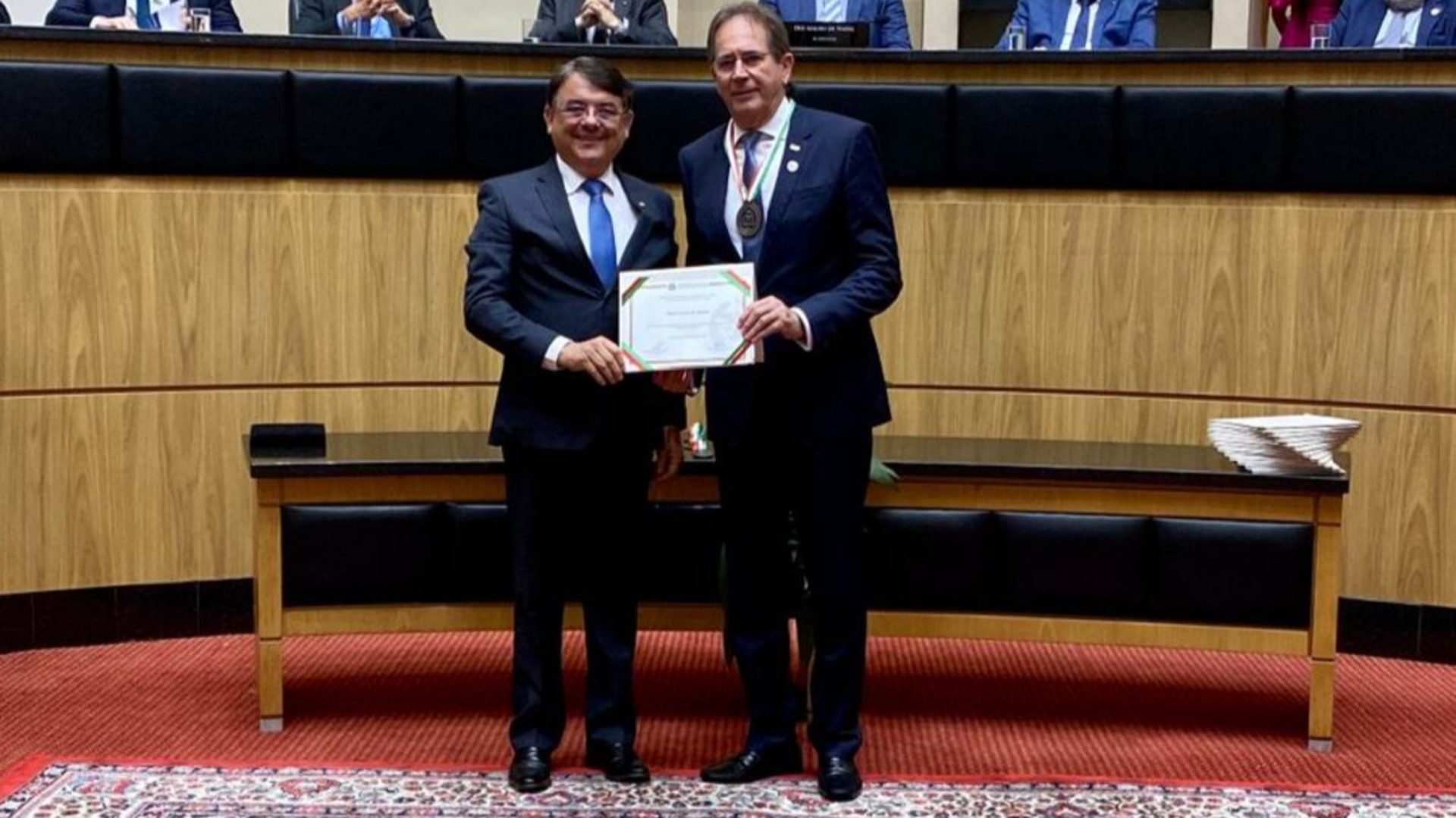O presidente da Fiesc, Mário Cezar de Aguiar, foi o escolhido para receber a Comenda do Legislativo Catarinense 2023 pelas mãos do deputado estadual, Maurício Peixer (PL), na noite desta segunda-feira, 20 de novembro.