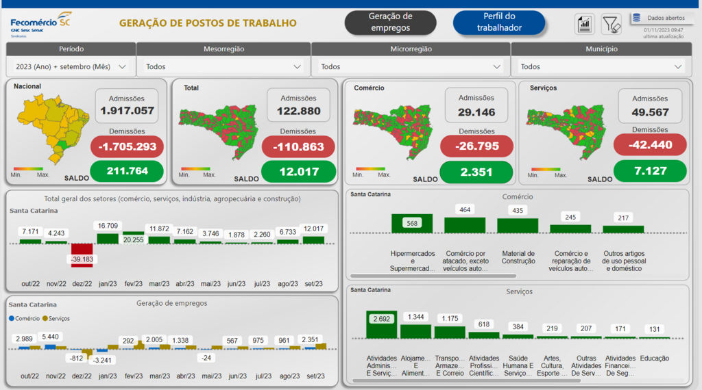 O saldo das contratações de trabalhadores formais em Santa Catarina foi de 12.017 vagas em setembro. O resultado é 78,5% superior ao do mês anterior, o terceiro maior saldo positivo do ano (20.255 em fevereiro e 16.709 em janeiro) e reforça a aceleração do ritmo de contratações no segundo semestre de 2023, revertendo assim à desaceleração observada ao longo do primeiro semestre de 2023.