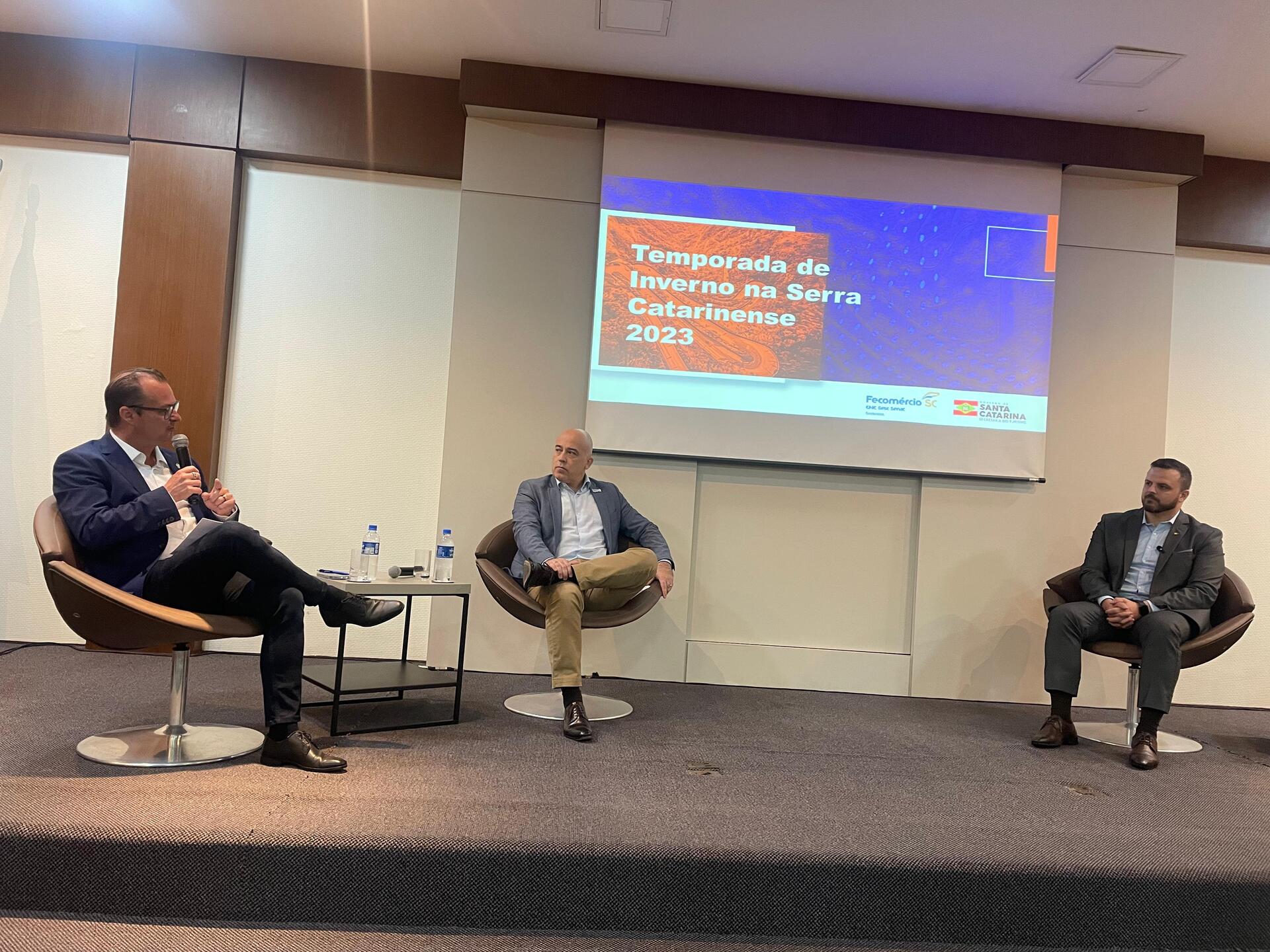 Painel após apresentação da pesquisa com secretário de Turismo de SC, vice-presidente da Fecomércio, deputado Lucas Neves e representante do IGR da Serra, Eliseu Farias (Fotos: Rubens Cardiga)