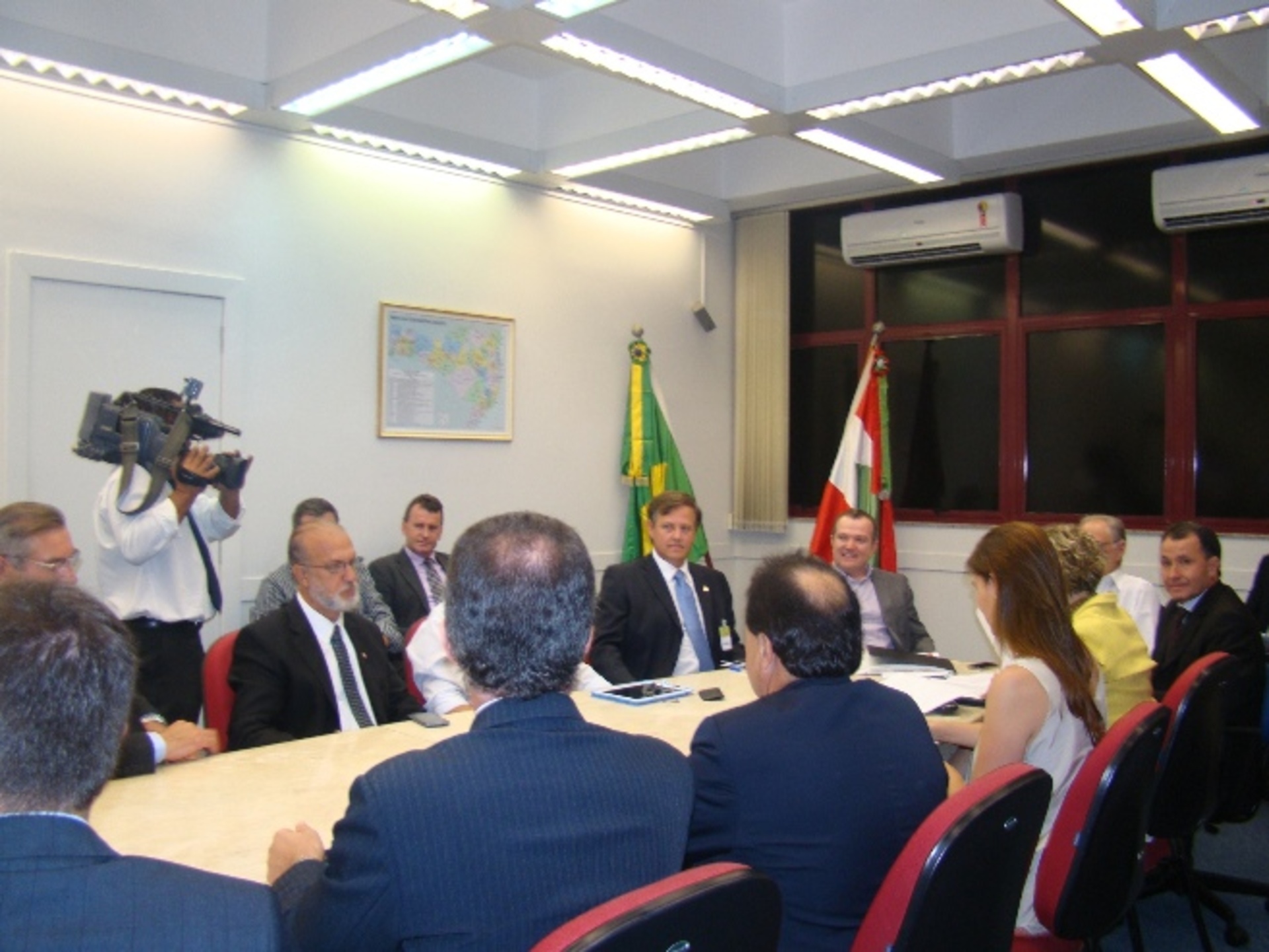 O encontro aconteceu no gabinete do Secretário Gavazzoni, no Centro Administrativo, e contou com as presenças de representantes da FCDL SC, Facisc, Fecomércio, Fampesc e CRC e dos deputados Ana Paula Lima (PT), Angela Albino (PCdoB), Dirceu Dresch (PT), Darci de Mattos (PSD), Silvio Dreveck (PP), Nílson Gonçalves (PSDB) e Maurício Eskudlark (PSD), além do deputado Renato Hinnig, secretário das Secretarias Regionais de Governo.