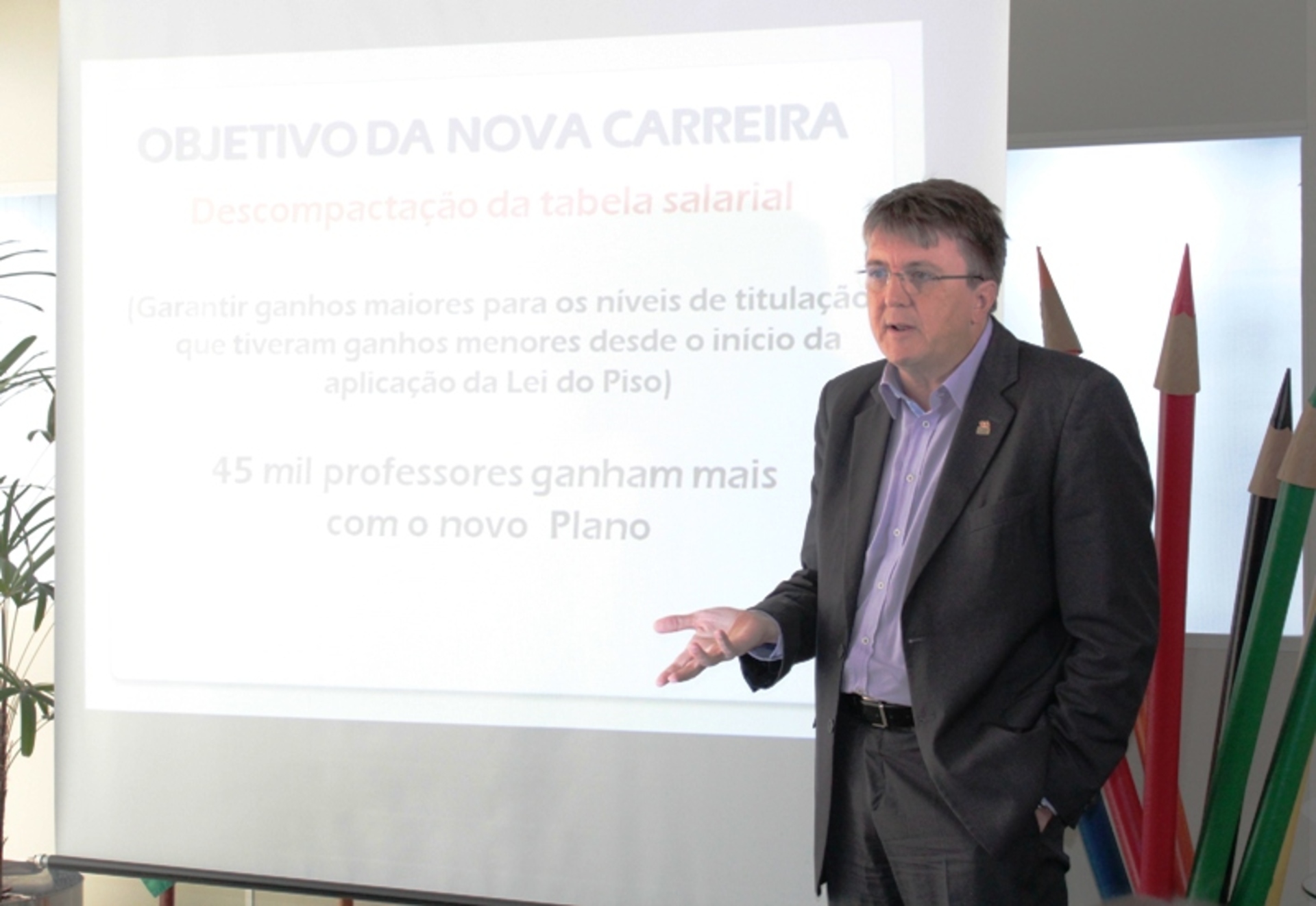 O secretário de Estado da Educação, Eduardo Deschamps, apresentou nesta segunda-feira (13), o texto final da proposta do novo plano de carreira do magistério público estadual e lei do professor ACT. A reformulação do texto foi feita após a revogação da MP 198, que tratava da forma de contratação e remuneração dos Admitidos em Caráter Temporário. Os itens da nova proposta já haviam sido apresentados pelo secretário aos professores durante a manhã. Deschsmps afirma que está confiante e diz que o novo plano atende as expectativas da maioria dos servidores.