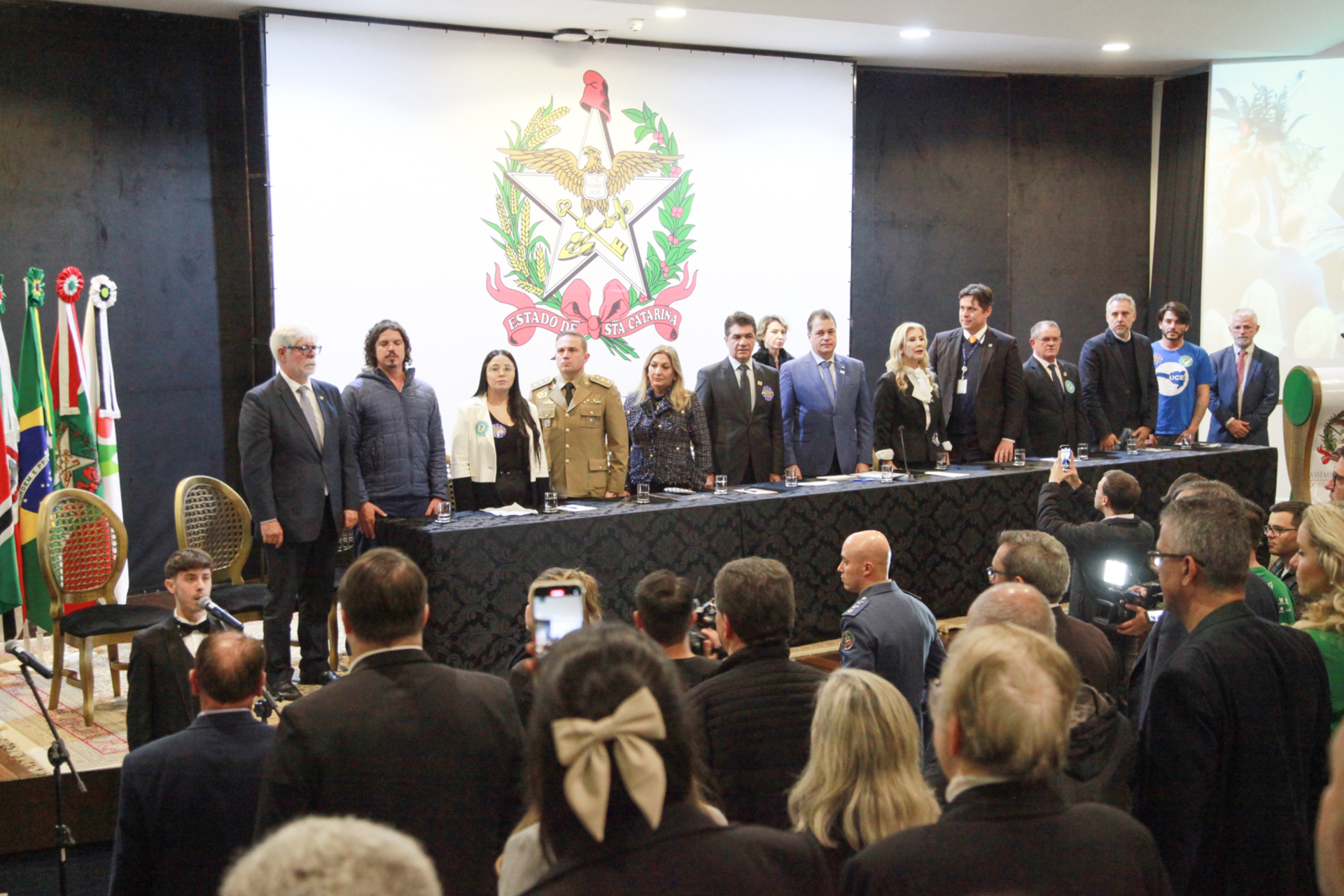 Entre as autoridades, estavam o deputado proponente da solenidade, Rodrigo Minotto (PDT), os deputados Marquito (Psol) e Tiago Zilli (MDB), e o prefeito do município, Clésio Salvaro (PSD).