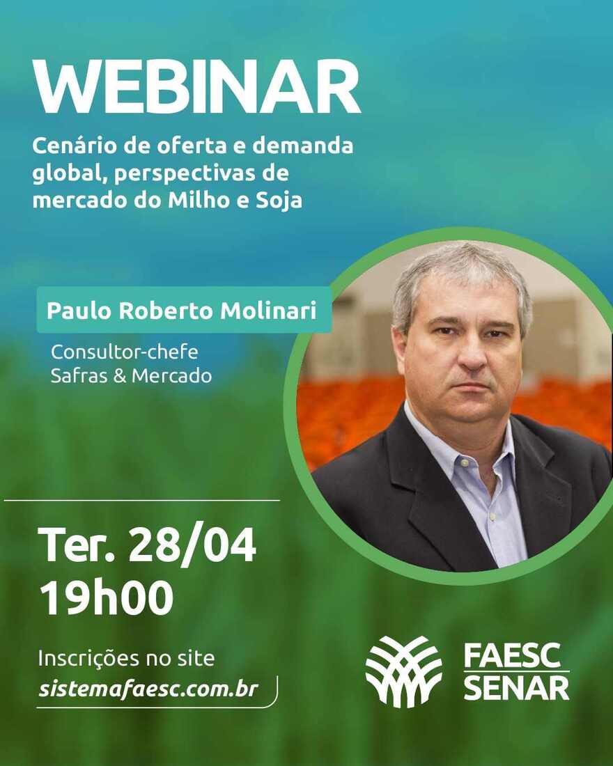 “Cenário de oferta e demanda global: perspectivas de mercado de milho e soja” é o tema do segundo webinar gratuito do ano, promovido pelo Sistema Faesc/Senar em parceria com a consultoria Safras & Mercado, no dia 28 de abril, às 19 horas. A iniciativa tem como objetivo qualificar e atualizar o setor agropecuário e integra a série de eventos dedicada ao mercado agropecuário em 2026.