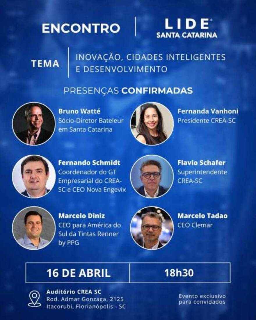 “Inovação, Cidades Inteligentes e Desenvolvimento Econômico” é o tema do Painel LIDE Especial que será realizado nesta quinta-feira (16), na sede do CREA-SC, em Florianópolis. O encontro reúne lideranças empresariais e institucionais para discutir estratégias voltadas ao crescimento sustentável e ao futuro das cidades.