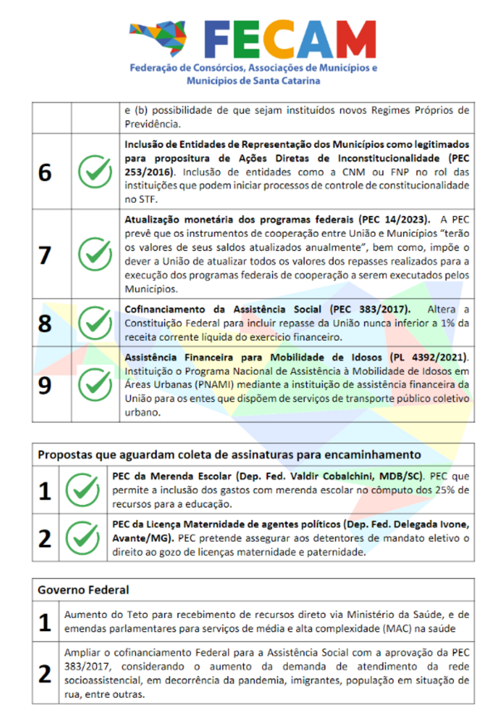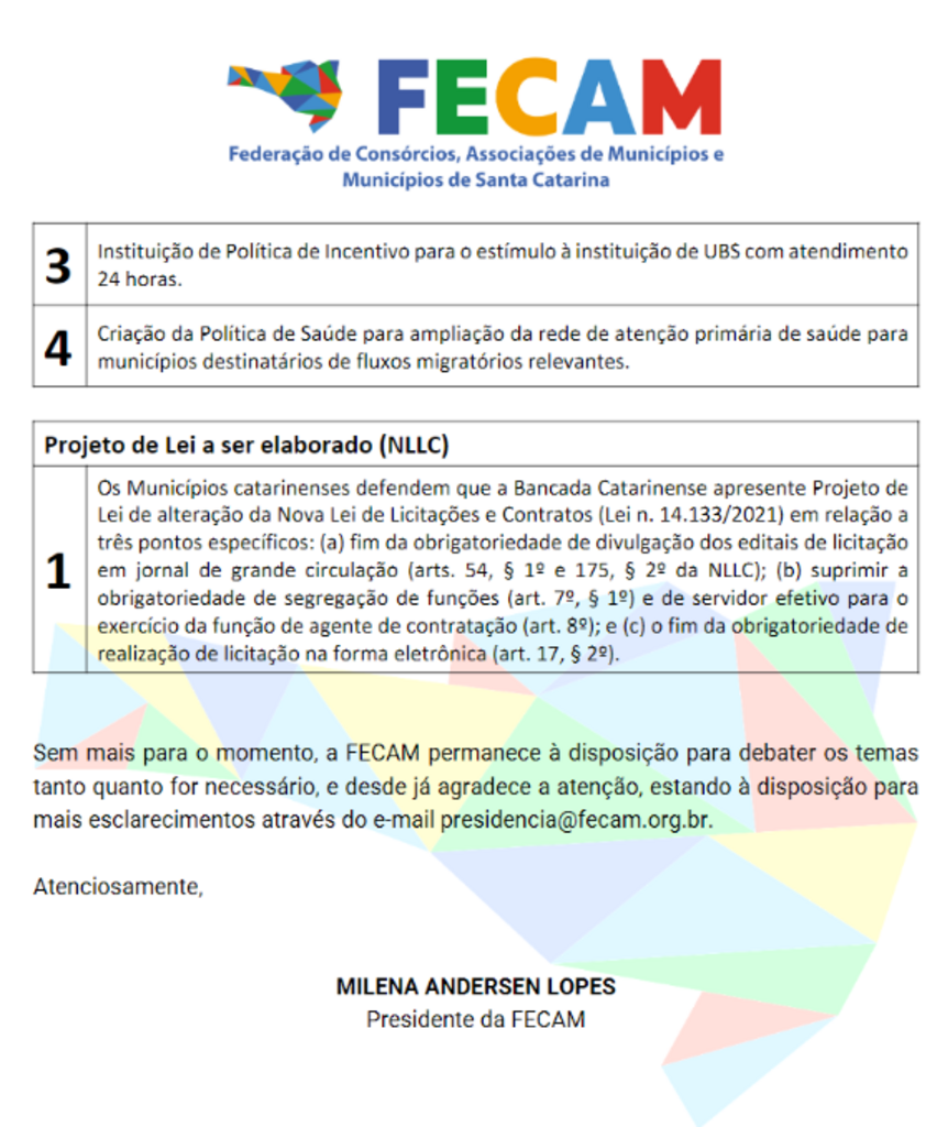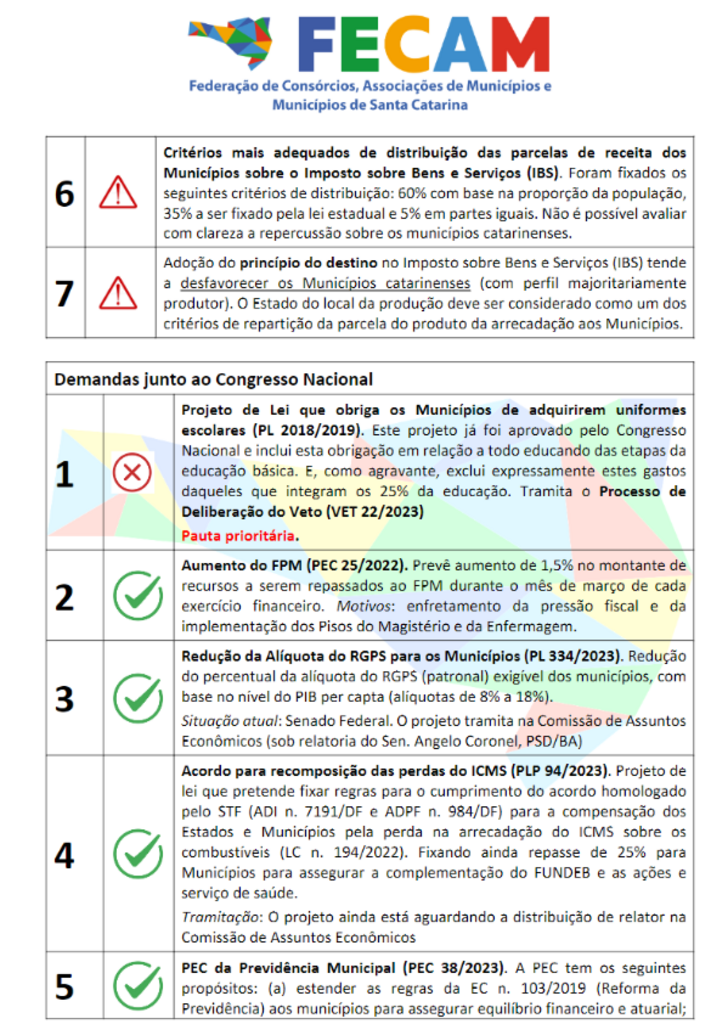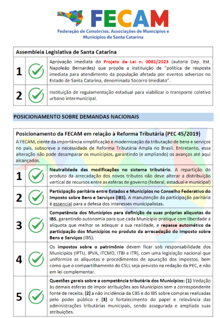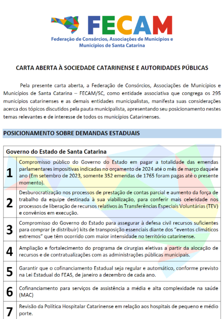 A carta apresenta reivindicações aos governos federal e estadual e pede, por exemplo, o pagamento total, por parte do governo catarinense, das emendas parlamentares impositivas indicadas no orçamento de 2024 até o mês de março, a revisão da política hospitalar em relação aos municípios de pequeno e médio porte e a instituição de uma regulamentação estadual para viabilizar o transporte coletivo urbano intermunicipal.