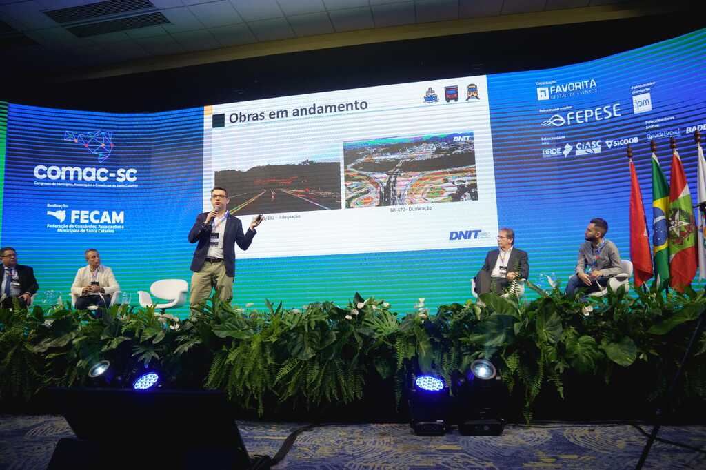 Logo pela manhã, o painel "Rodovias, infraestrutura e diagnóstico" reuniu o superintendente regional do DNIT, Alysson de Andrade e o presidente da Fiesc, Mário César de Aguiar, o secretário adjunto de Infraestrutura, Ricardo Grando, e o secretario executivo da Fetrancesc, Renato Macedo, com mediação do prefeito de Ascurra, Arão Josino.