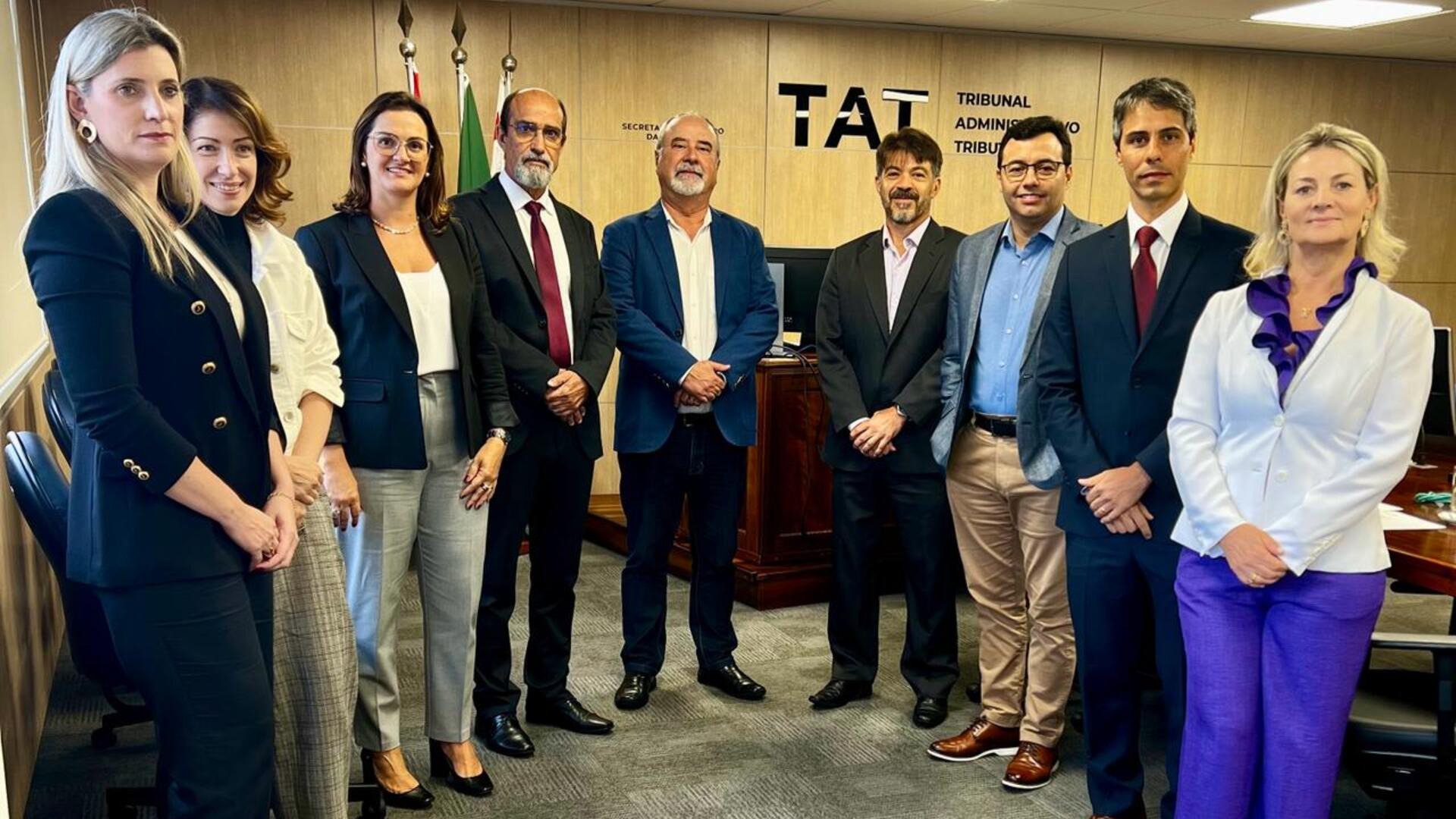 Conselheiras Andreia Barbieri Zanluchi (FAESC), Patrícia Fogaça (FIESC) e Manuella Mazzocco (FECOMERCIO); o Presidente do TAT, Sr. Newton Gonçalves de Souza; o Vice-Presidente do TAT, Sr. Celso Antônio de Carvalho; e os Conselheiros do Fisco, Lucian Eduardo de Oliveira, Robson Vitor Gotuzzo e Camargo de Carvalho Oliveira; e a Procuradora do Estado, Jocélia Aparecida Lulek (Fotos: )