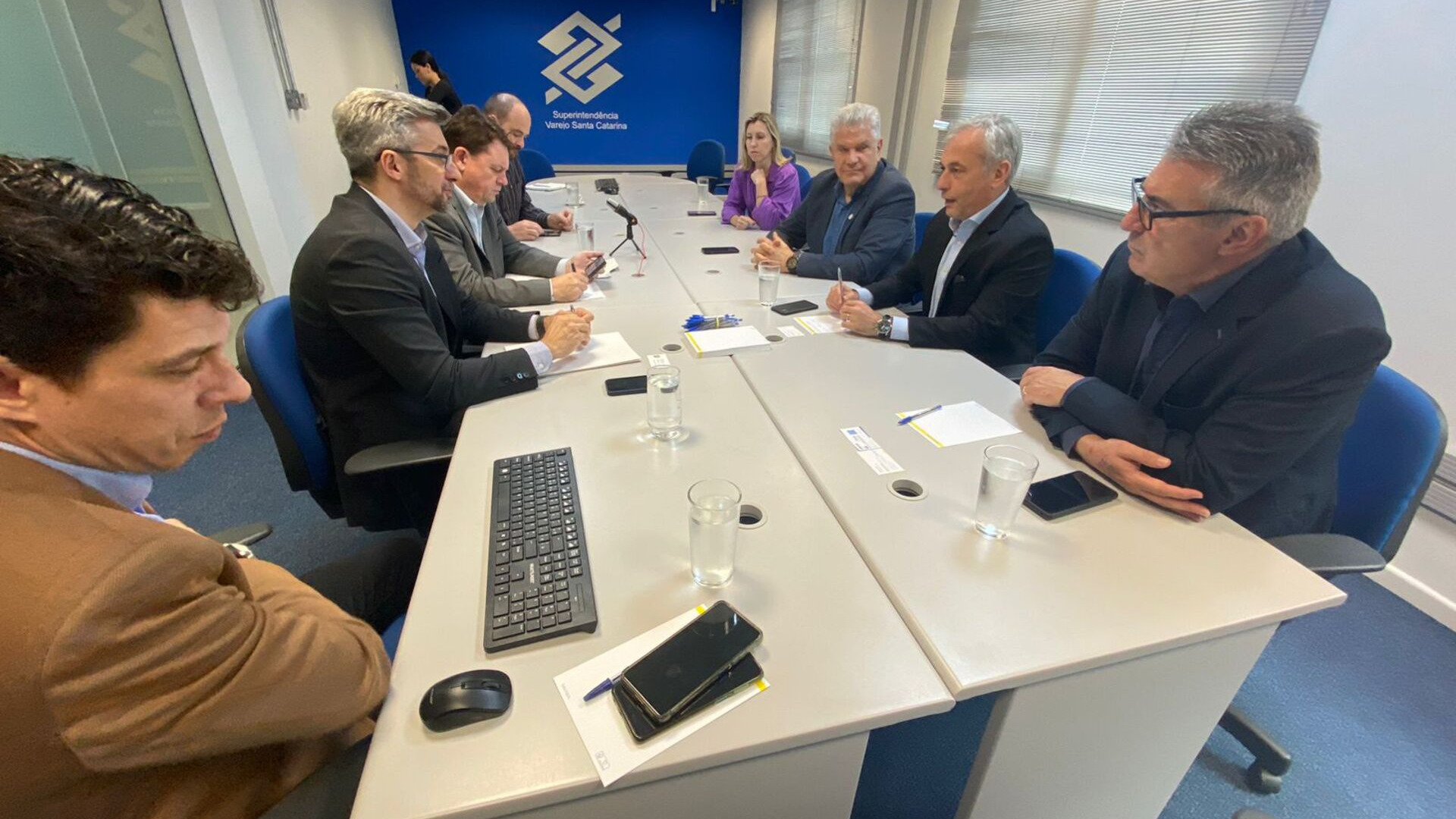 Além dos representantes do BRDE, participaram da reunião também o superintendente do Banco do Brasil, Rafael Alessi; o superintendente da Caixa Econômica, Rodrigo Medeiros; e o presidente do Badesc, Ari Rabaiolli.