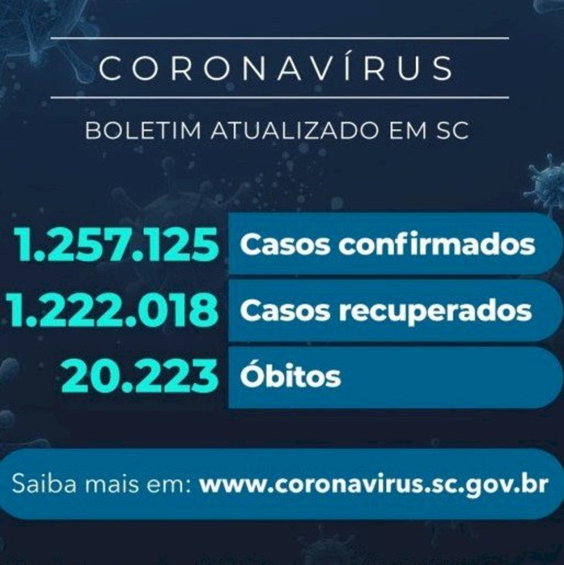 Coronavírus em SC: Estado confirma 1.263.180 casos, 1.223.271 recuperados e 20.224 mortes