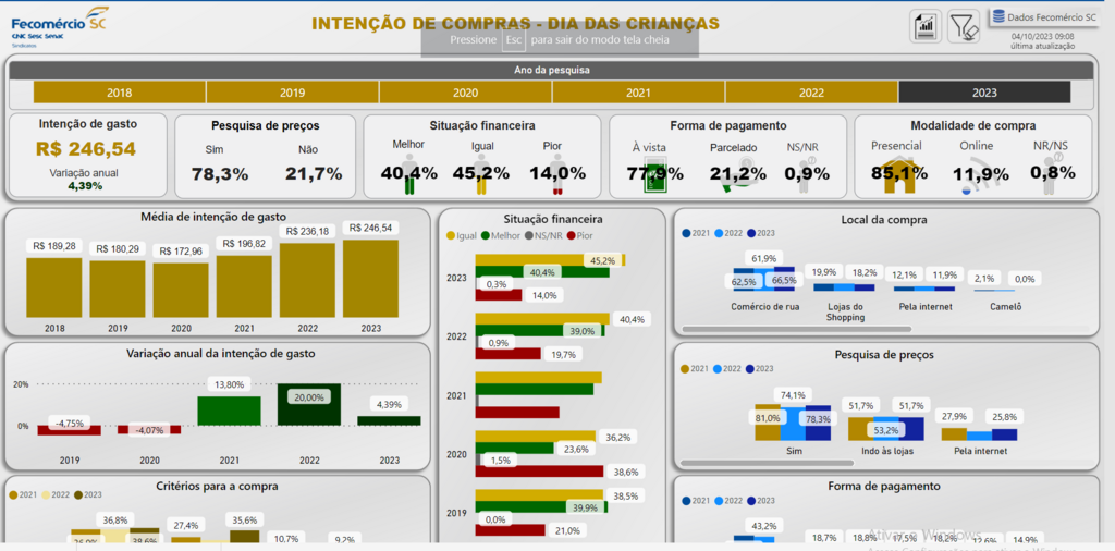 A pesquisa de intenção de compras do Dia das Crianças de 2023 apontou avanço na intenção de gasto médio dos consumidores catarinenses em 4,4% frente ao ano anterior. Assim, a expectativa de dispêndio médio é de R$ 246,54, o maior resultado nominal da série histórica. Todavia, o resultado, comparado em termos reais, está ligeiramente abaixo, -0,2%, do de 2022.