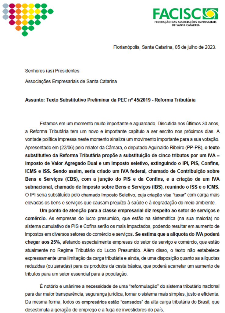Segue o posicionamento da Facisc sobre o texto Substitutivo Preliminar da PEC nº 45/2019 - Reforma Tributária. À medida que as discussões avancem, traremos novos posicionamentos.