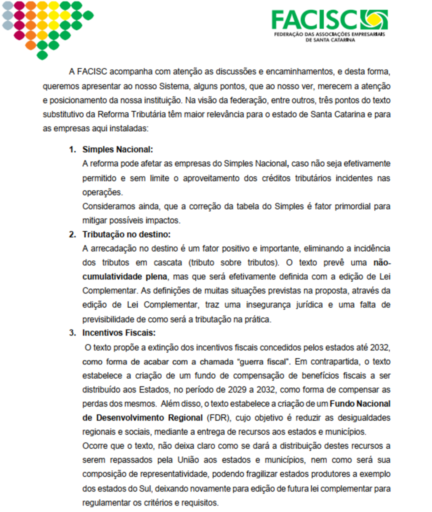 A entidade, que representa mais de 38 mil empresas em Santa Catarina ligadas a 149 associações empresariais, publicou nesta quarta-feira, 5/7, o posicionamento sobre os impactos da Reforma Tributária que está em discussão e que será votada nos próximos dias.