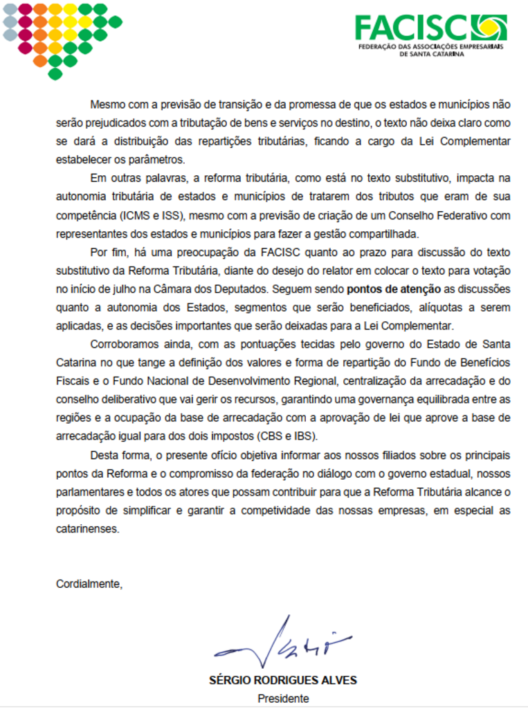 Confira a NOTA DA FACISC SOBRE REFORMA A TRIBUTÁRIA