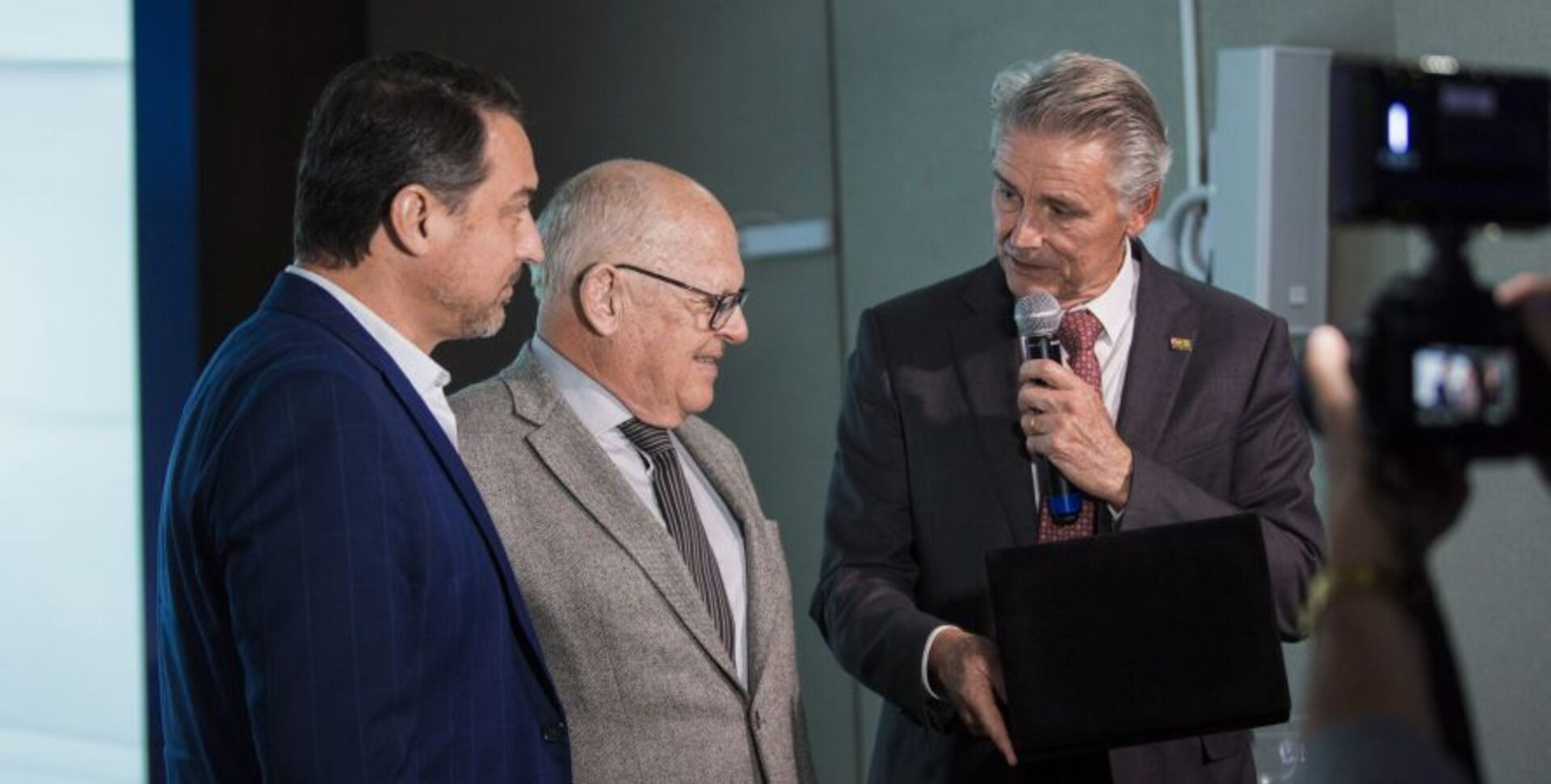 O Presidente da FACISC, Sérgio Rodrigues Alves, acompanhado com o governador do Estado, Carlos Moisés da Silva (Republicanos) e Jonny Zulauf, presidente da Fundação Empreender, em evento da FACISC (Fotos: Antônio Rossi)