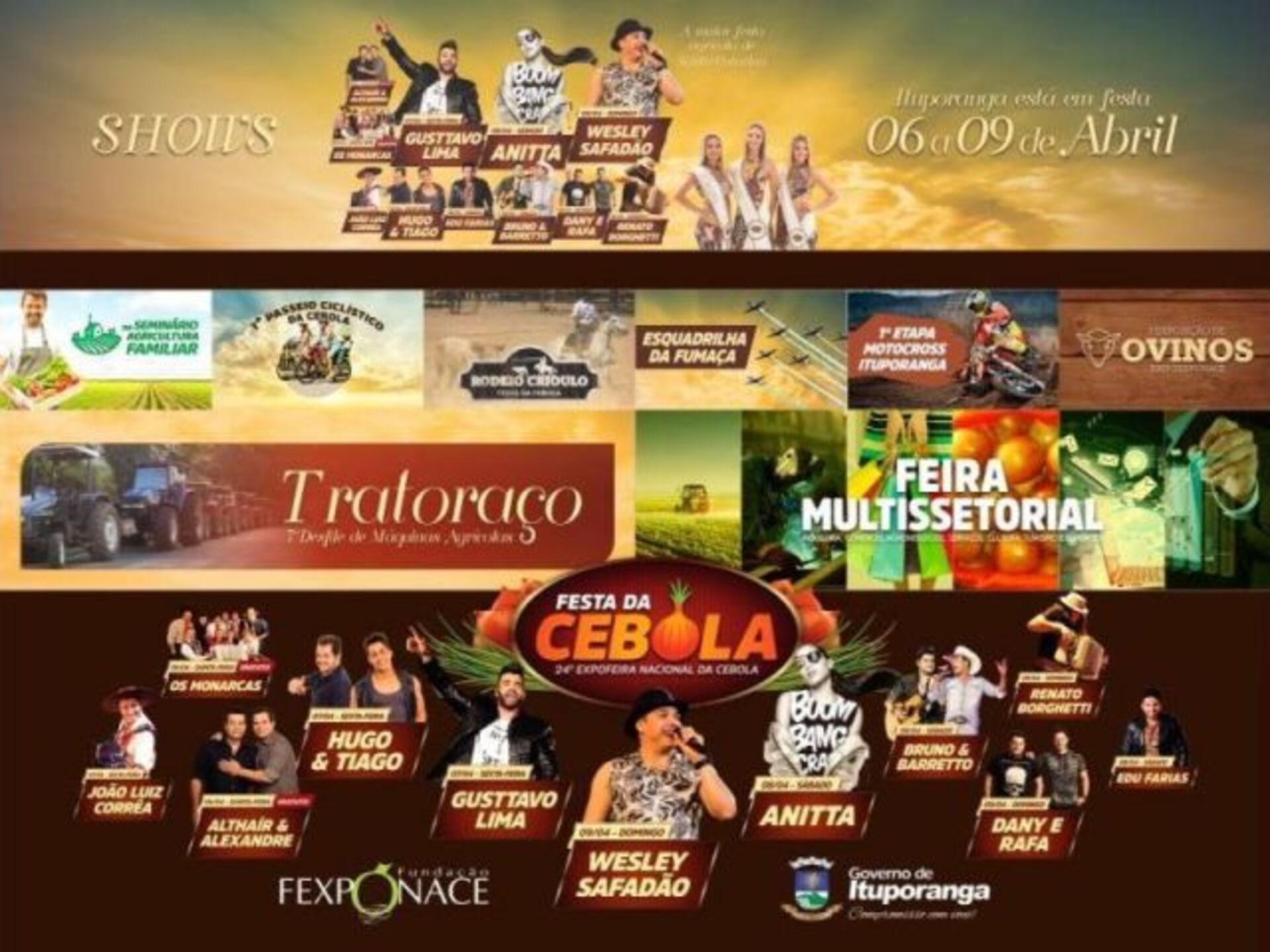 Além dos grandiosos shows já confirmados pela organização da 24ª Expofeira Nacional da Cebola, que incluem nomes como Gustavo Lima, Bruno e Barreto, Anitta, Hugo e Thiago e Wesley Safadão, fica confirmado mais de 11 shows nacionais, apresentações artísticas e culturais durante os quatro dias de festa, MotoCross, Rodeio Crioulo, Tratoraço, Esquadrilha da Fumaça, Exposição de Ovinos, Cebola e Multissetorial, Seminário da Agricultura Familiar, Passeio Ciclístico e muitas outras atrações.