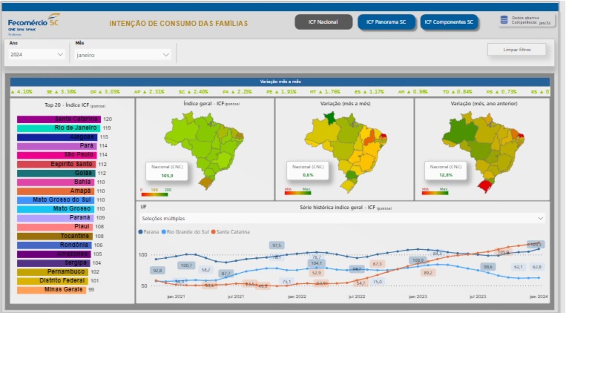 A Intenção de Consumo das Famílias Catarinenses (ICF) continua em ascensão, marcando o vigésimo segundo mês consecutivo de aumento. Em janeiro de 2024, o índice registrou um crescimento de 2,4% em relação a dezembro, consolidando-se na zona otimista com 119,5 pontos.