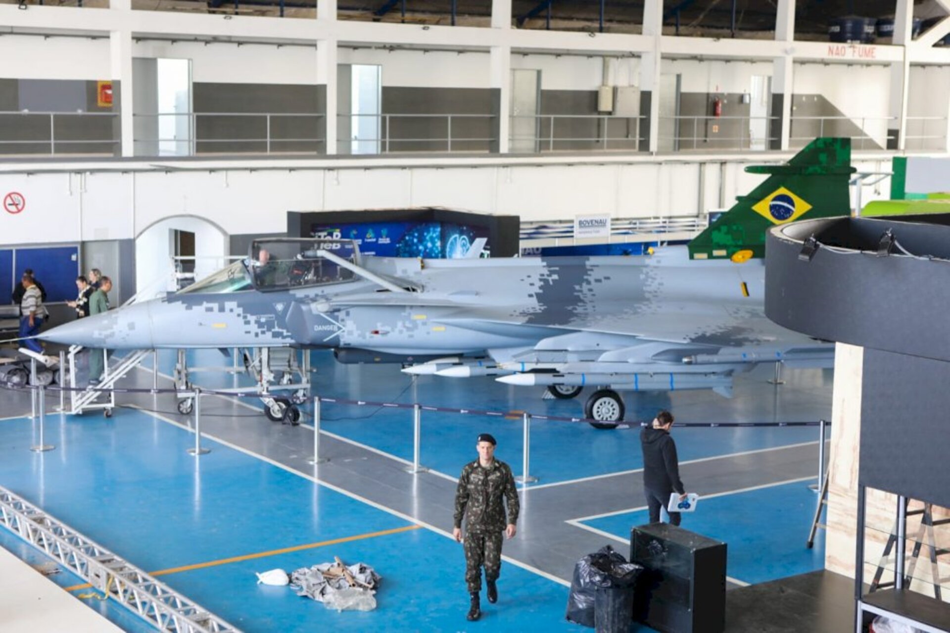 Aeronave da Força Aérea Brasileira (FAB) já está exposta na Base Aérea de Florianópolis, onde a FIESC realiza a feira de tecnologias e produtos de defesa,