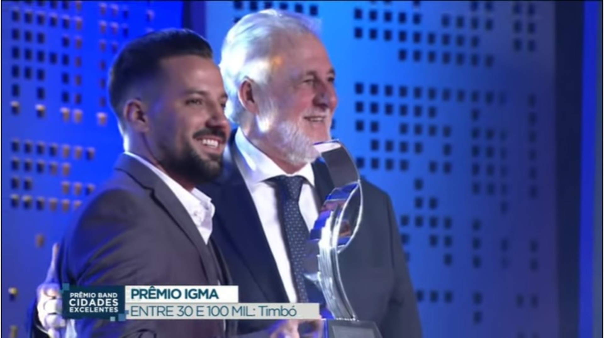 A eficiência da gestão pública de Timbó (SC) foi mais uma vez reconhecida pelo Prêmio Cidade Excelente, promovido pelo Instituto Aquila e o Grupo Bandeirantes. O município ficou em 1º lugar entre as cidades com população entre 30 mil e 100 mil habitantes no índice geral da avaliação, conquistando a melhor posição do País. Além disso, o Prefeito Jorge Krüge também trouxe de Brasília o troféu de 1º lugar nacional em Infraestrutura e mobilidade urbana.