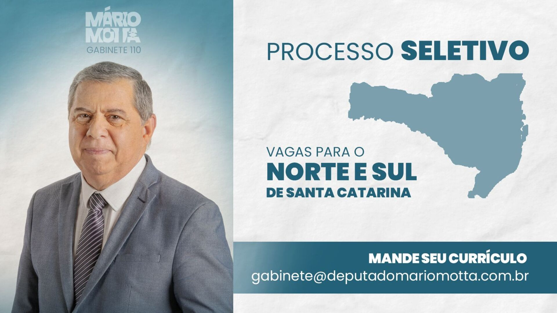 Assim como fez no início do mandato, quando abriu inscrições para a seleção da equipe do gabinete, o deputado Mário Motta (PSD) novamente lança processo seletivo para a contratação de profissionais, mas desta vez com vagas para o norte e sul do estado. Os interessados, que devem residir nestas regiões, podem mandar currículo para o e-mail [email protected].