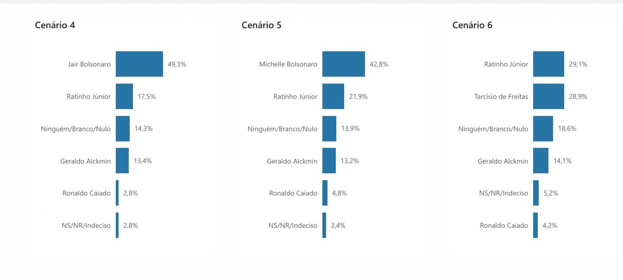 Foram projetados vários cenários, envolvendo, além do ex-presidente e da ex-primeira dama, os atuais governadores de São Paulo (Tarcísio de Freitas); do Paraná (Ratinho Jr); e de Goiás (Ronaldo Caiado).