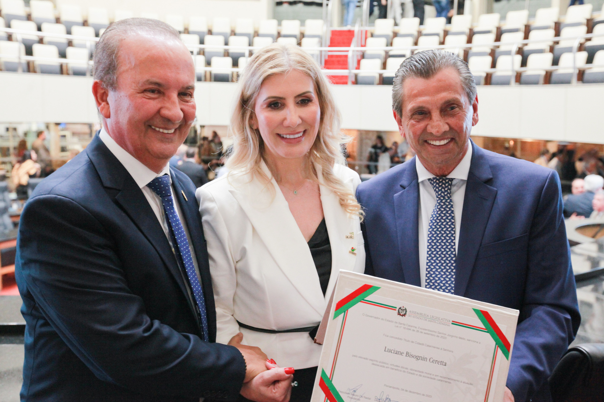 A presidente da Acafe recebeu o título de cidadã catarinense por indicação do parlamentar do PSD. Luciane Ceretta é gaúcha de Faxinal do Soturno e é reitora da Universidade do Extremo Sul de Santa Catarina (Unesc)