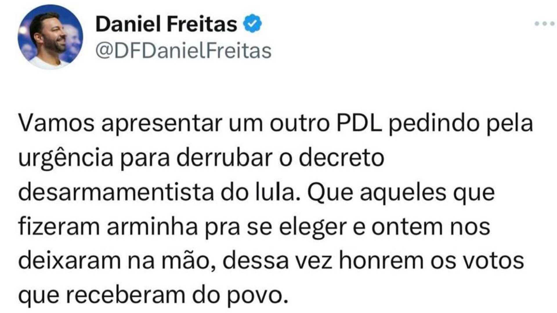 Segundo Daniel Freitas, 10 deputados bolsonaristas da oposição não votaram ou foram contra o Projeto de Decreto Legislativo que susta o decreto que suspende os registros para a aquisição e transferência de armas e de munições de uso restrito por caçadores, colecionadores, atiradores e particulares, restringe os quantitativos de aquisição de armas e de munições de uso permitido, dentre outras proibições. "Aqueles que fizeram arminha pra se eleger e ontem nos deixaram na mão, dessa vez honrem os votos que receberam", desabafou o parlamentar em suas redes.