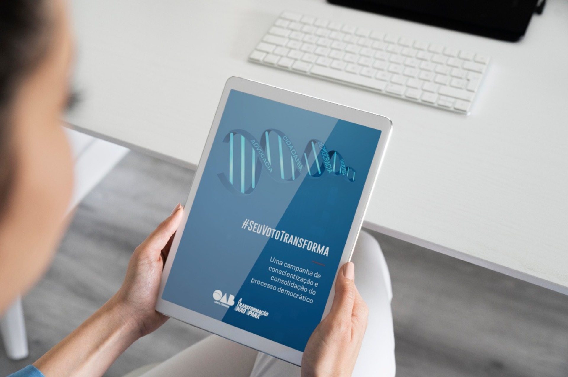 Enfrentamento à desinformação - a campanha #SeuVotoTransforma contribui, ainda, com a parceria firmada entre a OAB/SC e o Tribunal Superior Eleitoral (TSE) no "Programa Permanente de Enfrentamento à Desinformação no âmbito da Justiça Eleitoral”, uma vez que o termo prevê o desenvolvimento de ações para combater a desinformação relacionada às eleições de 2022, com o intuito de garantir a integridade do pleito. Além do e-book, a campanha conta ainda com peças informativas publicadas pela Seccional catarinense em seus canais digitais.