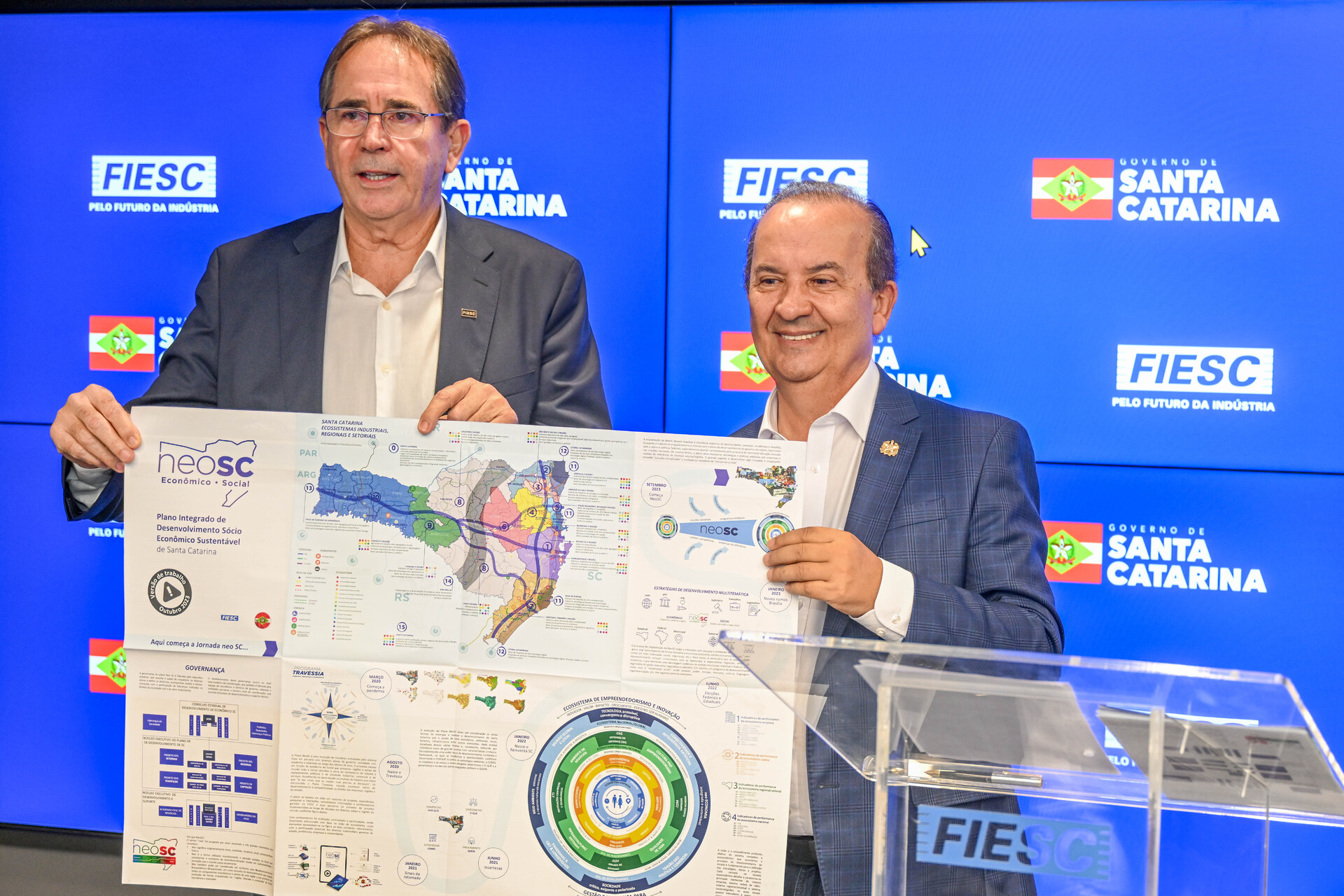 O Governo do Estado recebeu nesta quinta-feira, 14, da Federação das Indústrias de Santa Catarina (Fiesc), o Plano Integrado de Desenvolvimento Sócio Econômico Sustentável de Santa Catarina. Chamado de NeoSC, o documento traz estudos e sugestões para melhorar a competitividade produtiva catarinense e foi entregue ao governador Jorginho Mello pelo presidente da entidade, Mario Cezar de Aguiar.