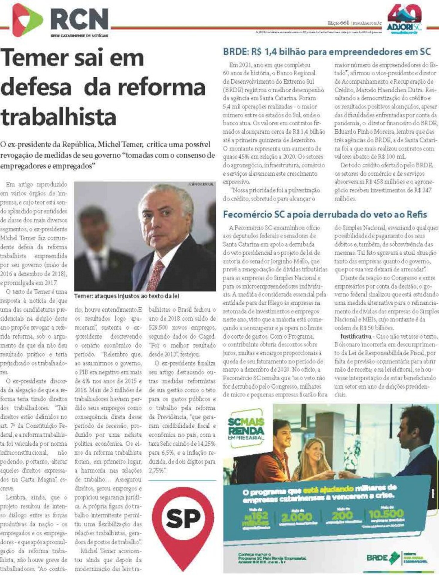 A página da Rede Catarinense de Notícias, elaborada pela Agência Adjori de Jornalismo, é o conteúdo impresso mais visto de Santa Catarina. Isso porque circula semanalmente em mais de 40 jornais de todas as regiões do Estado. A tiragem somada dos participantes supera 130 mil exemplares.