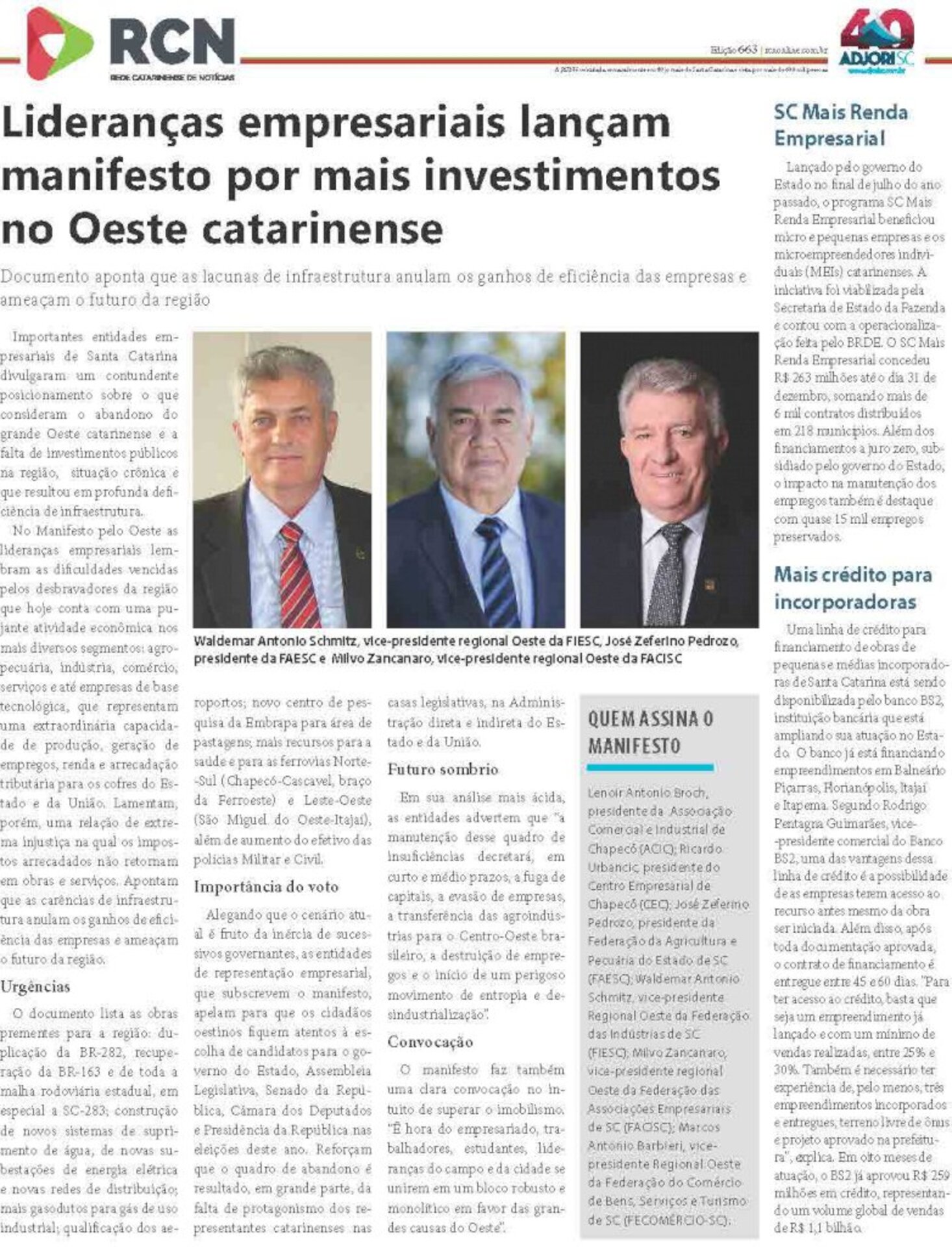 A página da Rede Catarinense de Notícias, elaborada pela Agência Adjori de Jornalismo, é o conteúdo impresso mais visto de Santa Catarina. Isso porque circula semanalmente em mais de 40 jornais de todas as regiões do Estado. A tiragem somada dos participantes supera 130 mil exemplares.