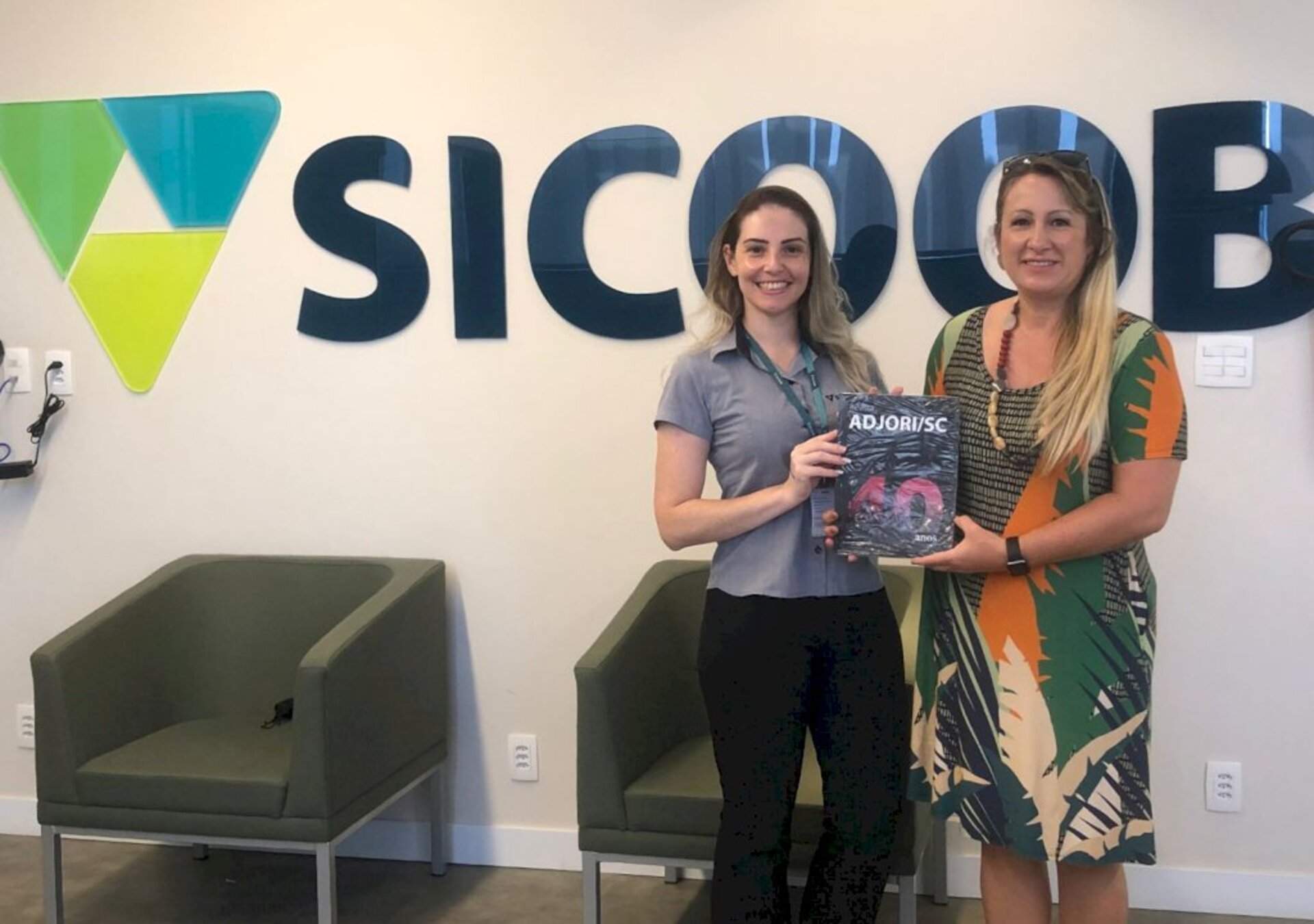 Ana Paula Furtado, do setor administrativo da agência Sicoob de Papanduva, recebe revista da Adjori/SC 40 Anos que retrata as iniciativas da Associação ao longo de quatro décadas. Entrega foi realizada pela proprietária do jornal Diário de Riomafra, Elisângela Schulka, vice-presidente da regional do Planalto Norte da Associação